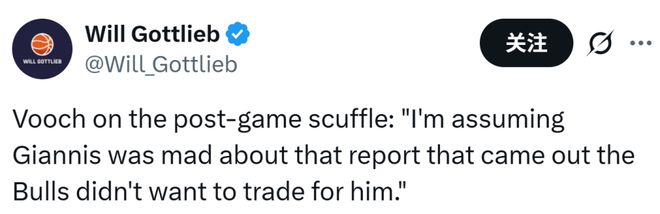 公牛中鋒武切維奇賽后則向記者表示:“我猜揚尼斯是因為看到有報道稱公牛隊無意通過交易得到他而生氣。”
