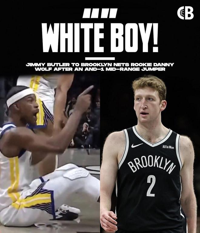 在比賽期間曾發生了這樣一幕:勇士隊巴特勒在一次進攻中面對籃網今年的27號秀丹尼-沃爾夫中投打中并造成犯規完成2+1,坐在地上的巴特勒指著沃爾夫大勝呵斥道“白人小屁孩兒!白人小屁孩兒!白人小屁孩兒!給我tmd閉嘴!每次都閉!”