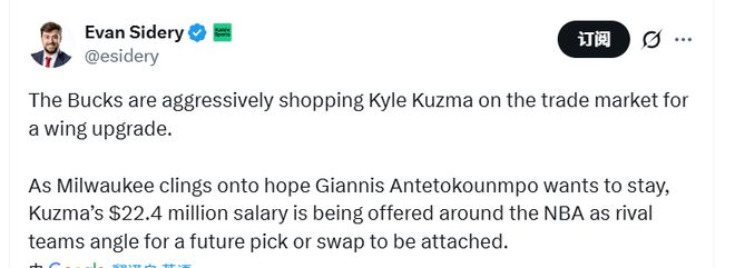 目前雄鹿仍在努力留住字母哥,在此背景下,球隊正為庫茲馬2240萬美元的年薪尋找下家。而聯(lián)盟中的競爭對手們則紛紛提出附加條件,希望在交易中獲得雄鹿的未來選秀權(quán)或選秀權(quán)互換資格。