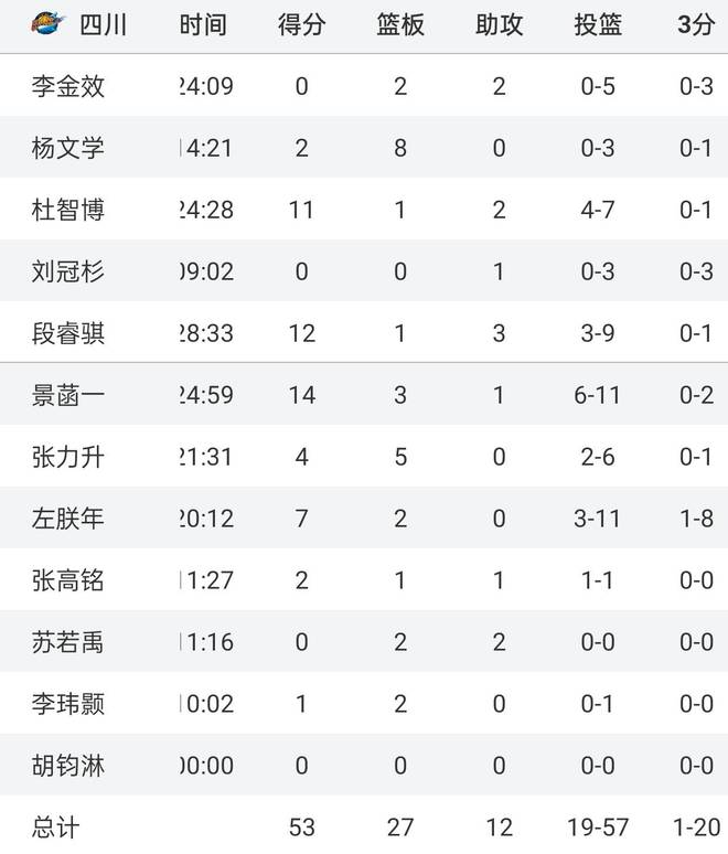 作為球迷,我們可以理解四川男籃的苦處,可以理解球隊為什么沒有外援,但是至少國內球員應該爭氣,結果呢?面對實力并不是特別強的南京同曦隊,全隊40分鐘就得到53分,甚至第四節單節就只得到可憐的8分,三分球更是20中1,其中李金效三分3中0,劉冠杉3中0,左朕年8中1,不僅有人防守下進不了,即便是大空位也進不了,球員們都這樣的表現,真可以說是最大混子球隊了。