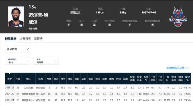 作為一名出生于1997年的得分后衛(wèi),鮑威爾已經(jīng)28歲了,按說該是單打之年,可惜,現(xiàn)實卻不是這樣的。已經(jīng)代表山東男籃打了3場比賽的鮑威爾,其數(shù)據(jù)可謂斷崖式下降了。過去3場比賽,鮑威爾場均出戰(zhàn)15分鐘,只能拿到8.3分2.7籃板3助攻,投籃命中率31%,三分球命中率7.1%,罰球命中率66.7%。