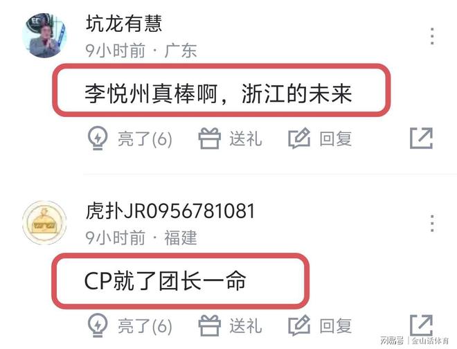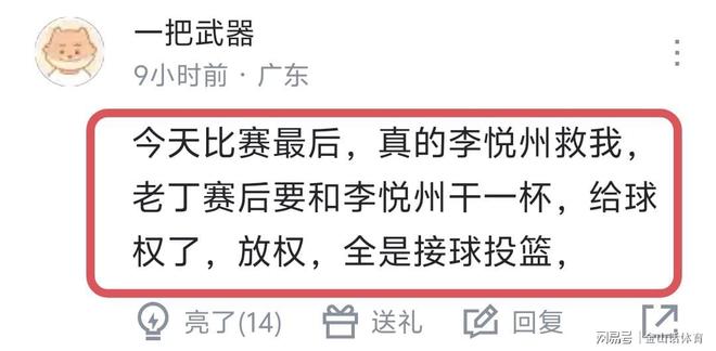 賽后,李悅洲本場比賽的表現,得到了眾多球迷的認可。“今天比賽最后,真的李悅州救我,老丁賽后要和李悅州干一杯,給球權了,放權,全是接球投籃。”;“李悅州真棒啊,浙江隊的未來”;“CP救了團長一命”;“不是小李飛刀,丁偉就下課了,是他救了團長!”……