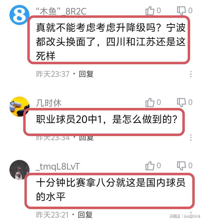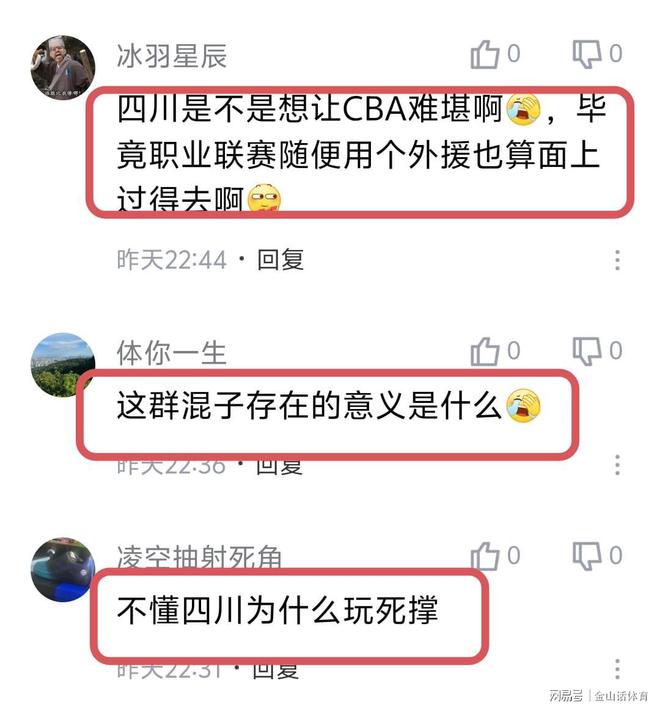“真就不能考慮考慮升降級嗎?寧波都改頭換面了,四川和江蘇還是這死樣?!?;“職業(yè)球員20中1,是怎么做到的?”;“十分鐘比賽拿八分,就這是國內(nèi)球員的水平。”;“四川隊(duì)是不是想讓CBA難堪啊,畢竟職業(yè)聯(lián)賽隨便用個(gè)外援也算面上過得去??!”;“這群混子存在的意義是什么”;“這群混子存在的意義是什么?”……