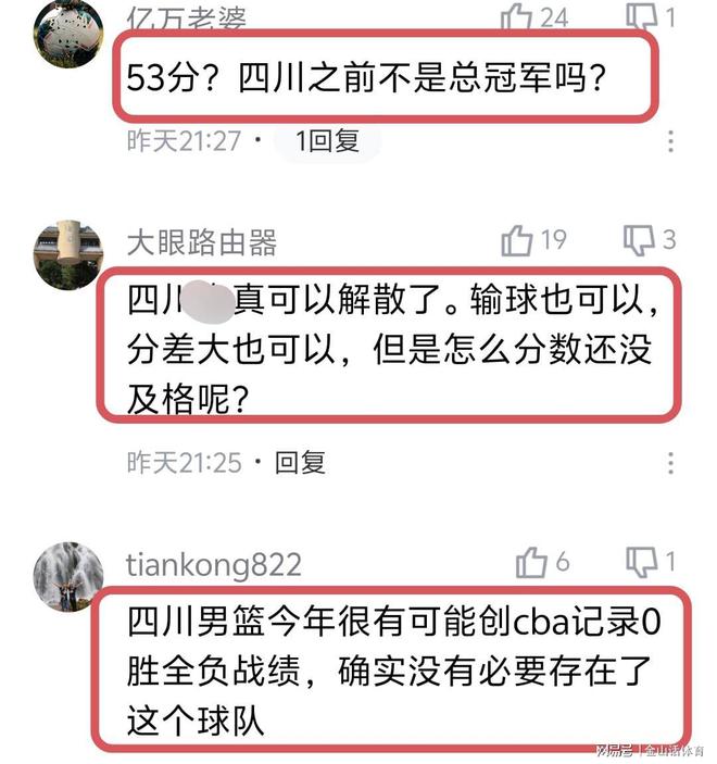 四川隊(duì)如今糟糕的表現(xiàn),也引來球迷的紛紛吐槽?!斑@種隊(duì)有什么存在的必要呢?還不如滾讓香港金牛遞補(bǔ)打呢”;“53分?四川之前不是總冠軍嗎?”;“四川隊(duì)真可以解散了。輸球也可以,分差大也可以,但是怎么分?jǐn)?shù)還沒及格呢?”;“四川男籃今年很有可能創(chuàng)cba記錄0勝全負(fù)戰(zhàn)績,確實(shí)沒有必要存在了這個(gè)球隊(duì)”。