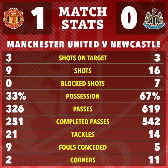達洛浪費了另一個提前確保勝局的良機,他接到利馬的長傳,但一腳挑射高出橫梁之外。幸運的是,這不妨礙曼聯(lián)最終贏球,因為如前所述,紐卡斯爾的射門比紅魔更爛。