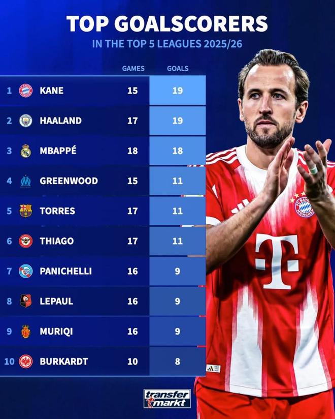 北京時間12月27日,德轉(zhuǎn)統(tǒng)計出了本賽季至今歐洲五大聯(lián)賽進球最多的10名球員,哈里-凱恩和哈蘭德同以19球排名第一,姆巴佩18球位列第三,此外格林伍德和費蘭-托雷斯也都榜上有名。