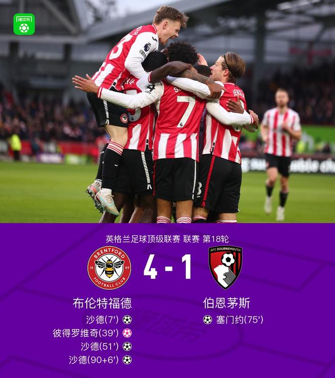 北京時間12月27日,英格蘭足球超級聯賽第18輪展開較量,布倫特福德坐鎮主場迎戰伯恩茅斯。比賽開局階段,伊戈爾-蒂亞戈送出助攻,沙德破門為布倫特福德先拔頭籌。此后,彼得羅維奇不慎將球打入自家球門,布倫特福德擴大領先優勢。易邊再戰,亞爾莫柳克成功助攻,沙德再度建功,完成個人第二粒進球。隨后塞門約為伯恩茅斯扳回一城。臨近結束,達姆斯高送出關鍵助攻,沙德完成帽子戲法,鎖定勝局。最終全場比賽結束,布倫特福德以4比1戰勝伯恩茅斯。