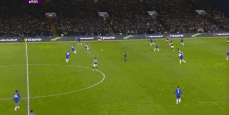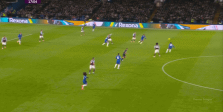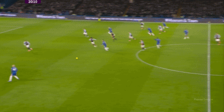 防守一側開始承受明顯的壓力,整體隊形就難免需要向這一側靠攏,而如此導致的結果,就是四后衛陣型無法覆蓋整個寬度的問題隨之暴露,在切爾西右側進攻的帶動下,左側的加納喬這邊也有了充裕的處理球的空間: