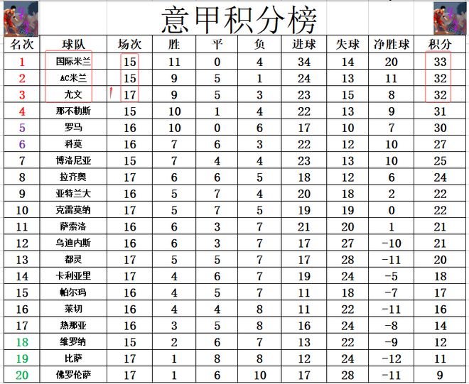 積分榜方面,尤文先賽贏球后奪取3連勝,多賽2場的他們追上AC米蘭,凈勝球劣勢排在第3,暫時只比榜首的國米少了1分。黑馬科莫止住頹勢,暫時超過博洛尼亞,重新回到前6。