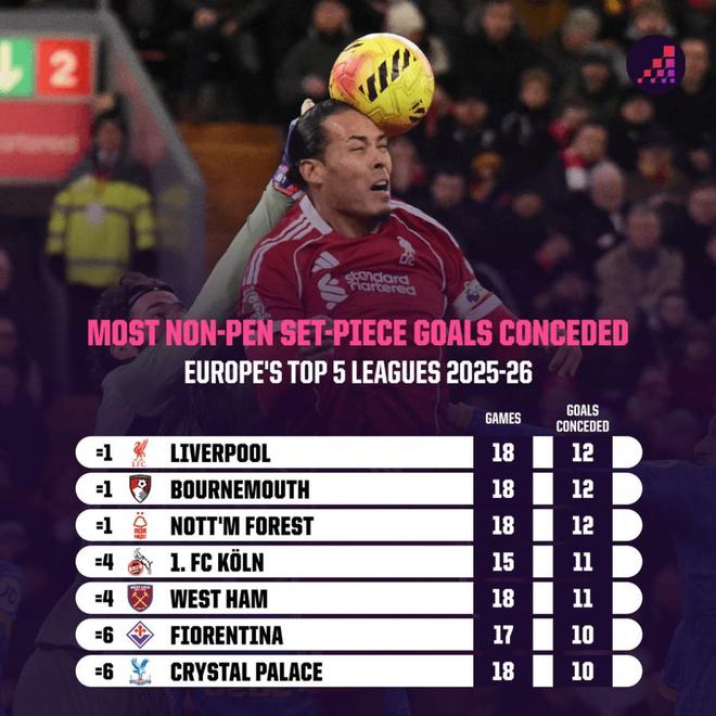 數據網站OPTA統計,在2025-26賽季歐洲五大聯賽中,利物浦、伯恩茅斯與諾丁漢森林三支球隊并列成為非點球定位球失球最多的球隊,均為18場比賽失球12個。