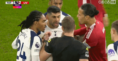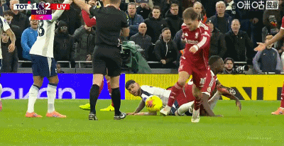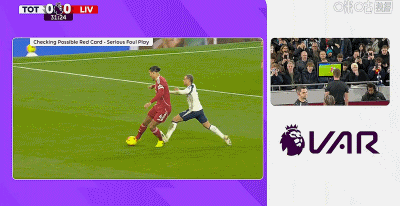 第33分鐘,哈維-西蒙斯踩踏范戴克小腿,VAR確認后被紅牌罰下,熱刺少一人作戰!