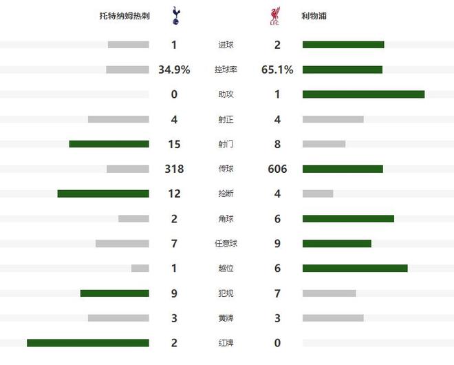 余下的時間,熱刺大舉壓上讓利物浦非常被動,第83分鐘替補登場的里沙利松,利用角球的機會,將比分追至1-2,4分鐘之后,里沙利松抓住瓊斯失誤的機會,再次完成打門,可惜這一次被封堵,傷停補時階段,羅梅羅報復性踢人,吃到第二張黃牌也被罰下,最終熱刺只能接受主場輸球的結局。
