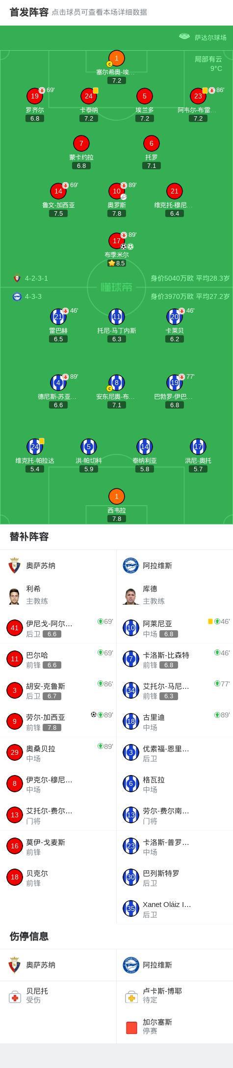下半場補時第3分鐘,奧薩蘇納球員勞爾-加西亞打入一球。