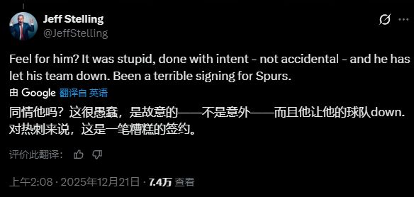 然而,前天空體育主持人、現(xiàn)任talkSPORT主持人的斯特林并不打算為這位22歲的球員說話。一位球迷表示為西蒙斯感到難過,斯特林在X上回應(yīng)道:“為他感到難過?那動作很愚蠢,是故意的,絕非意外,他讓球隊失望了。對熱刺來說,這是一筆糟糕的簽約。”